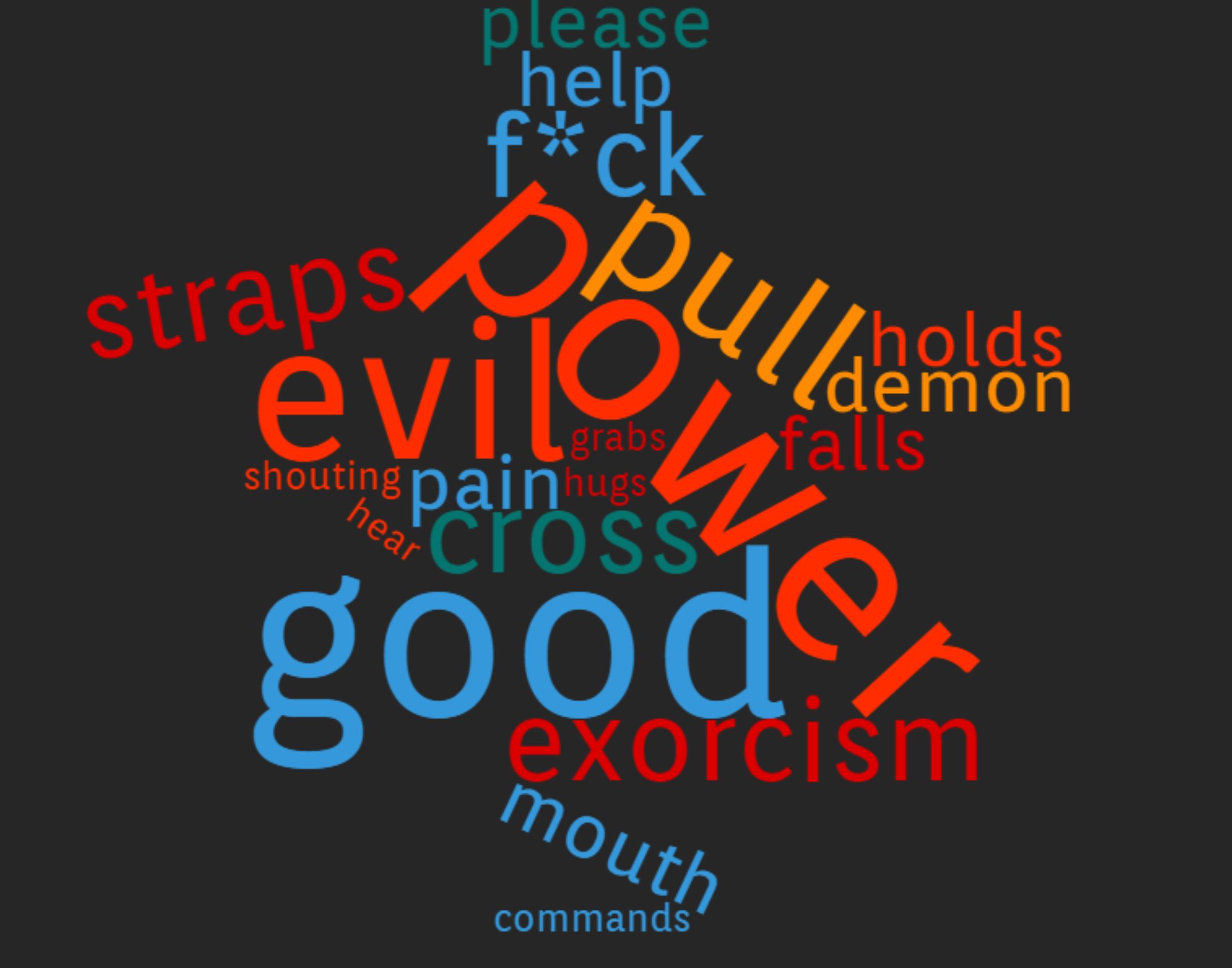 This word cloud shows a high incidence of the word smile. This could be due to all of the manipulation of Chris in the start of the film. Rose tricks Chris into thinking that she loves him. After she lures him to her family to be taken to the "sunken" place her true motives are revealed. The rest of the words including "dead", "hate", "shout", "scared", "blood" reveal the evil instincts of the Armitage family.