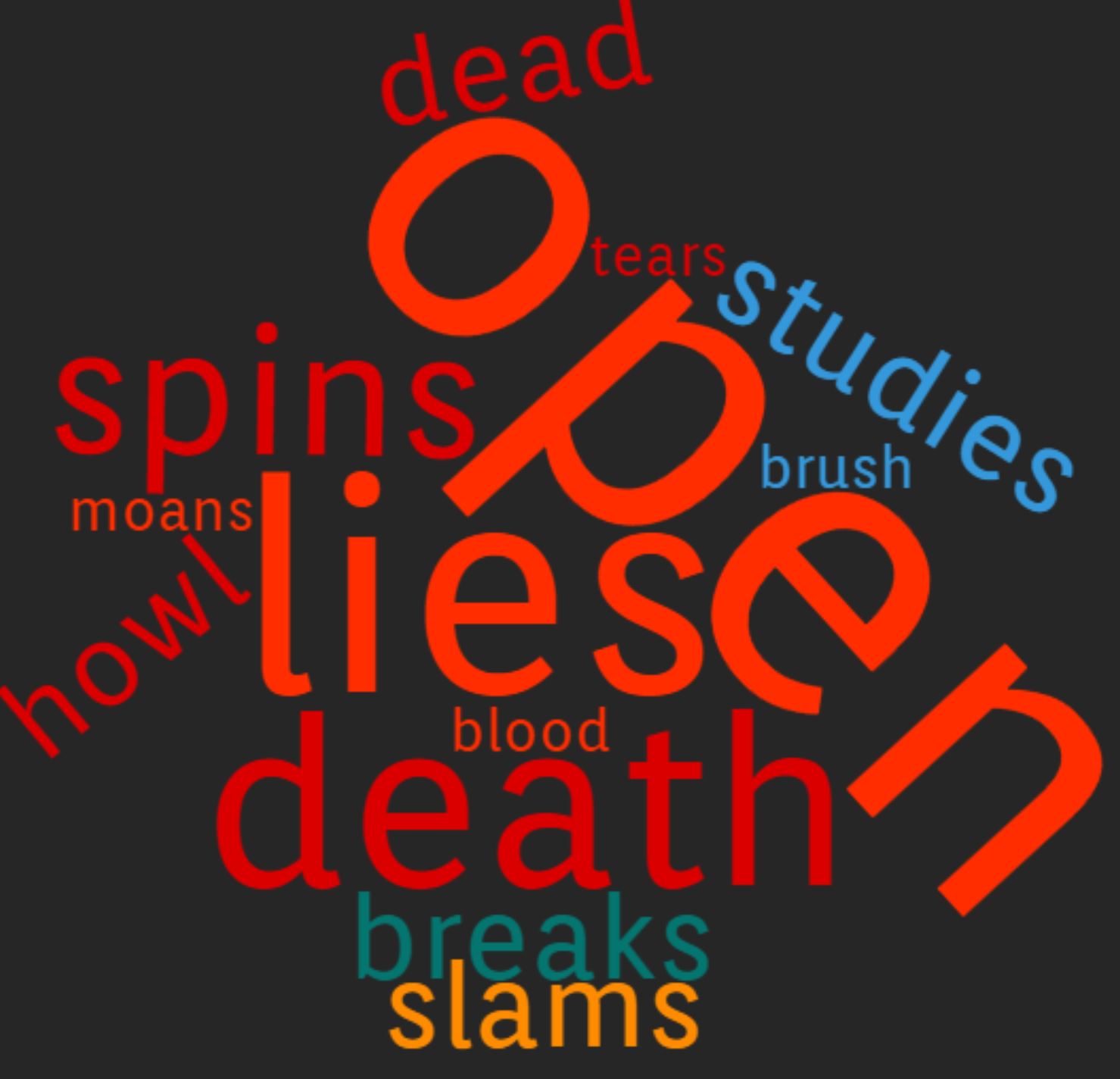 "Open" is one of the highest ranked words in Frankenstein. Probably due to all of Dr. Frankensteins procedures where he defiles humans and treats their body as experiments. "Lies" is the second highest ranked word which could be because Frankenstein lies about his true motivations. The other high incidence words are all extremely violent. The include "breaks", "slams", "death." These words are representative of the devolution of the creature and the doctor.
