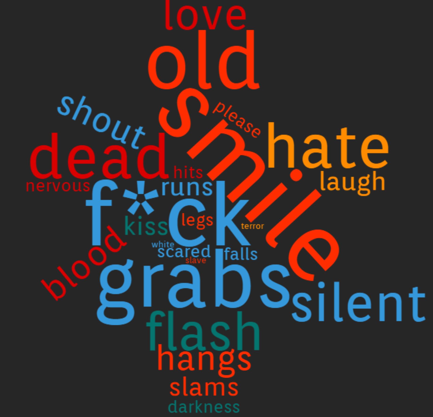 This word cloud shows a high incidence of the word smile. This could be due to all of the manipulation of Chris in the start of the film. Rose tricks Chris into thinking that she loves him. After she lures him to her family to be taken to the "sunken" place her true motives are revealed. The rest of the words including "dead", "hate", "shout", "scared", "blood" reveal the evil instincts of the Armitage family.