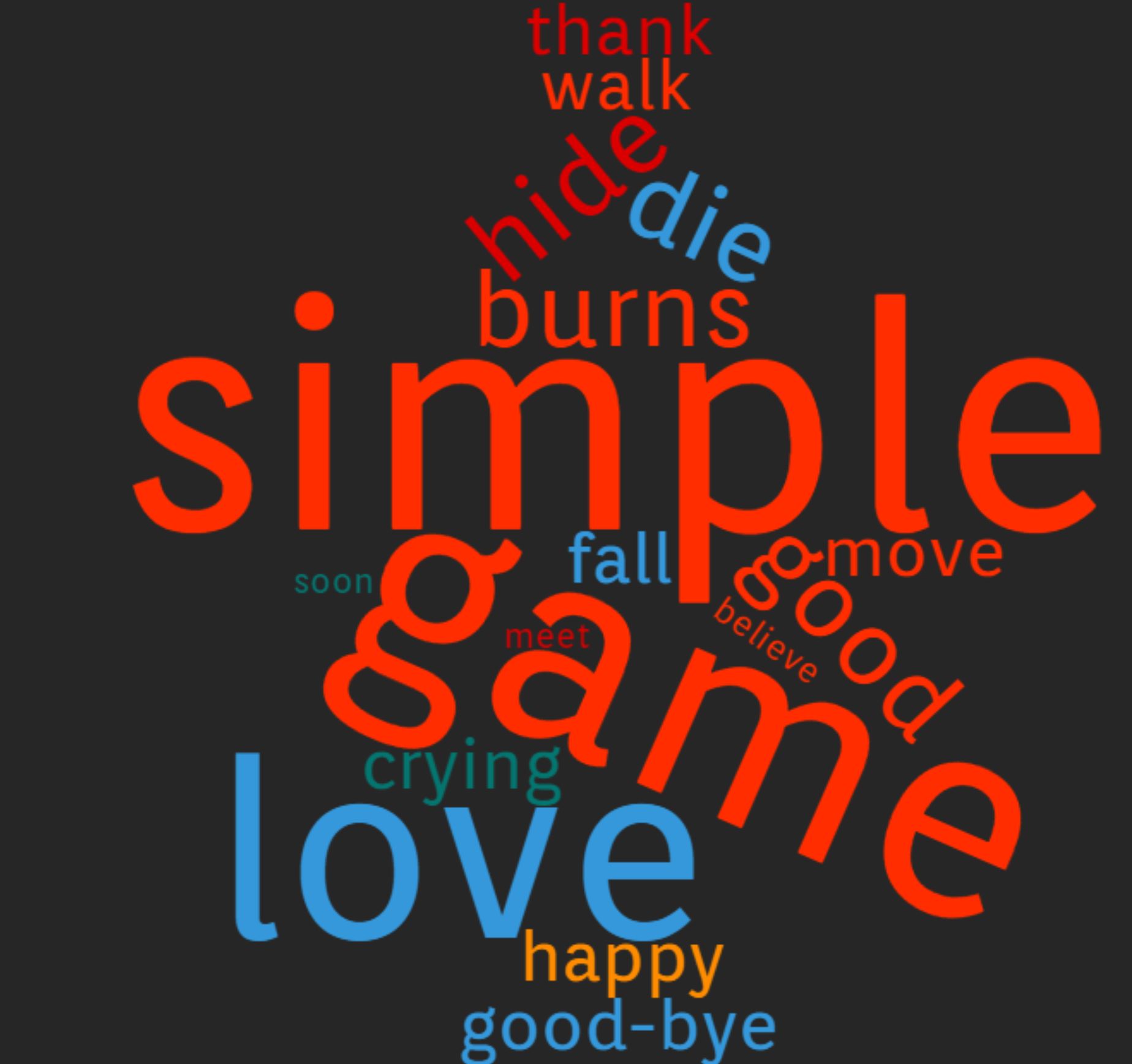 Throughout the movie we see Guido creating a fun made-up world for his son in order to keep his son away from the horrors of reality. The world the father creates is represented in this word cloud through the high incidence of "simple", and "game."However, parts of the true reality peak out with the words "crying" and "die."